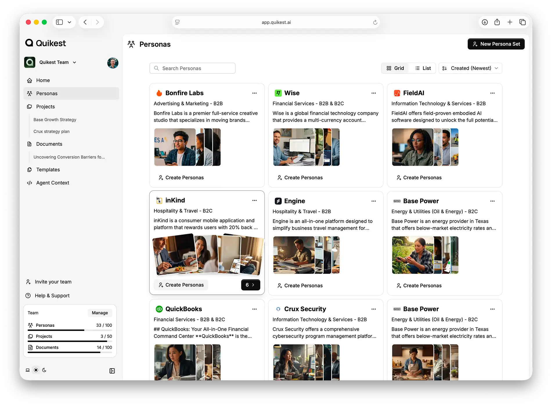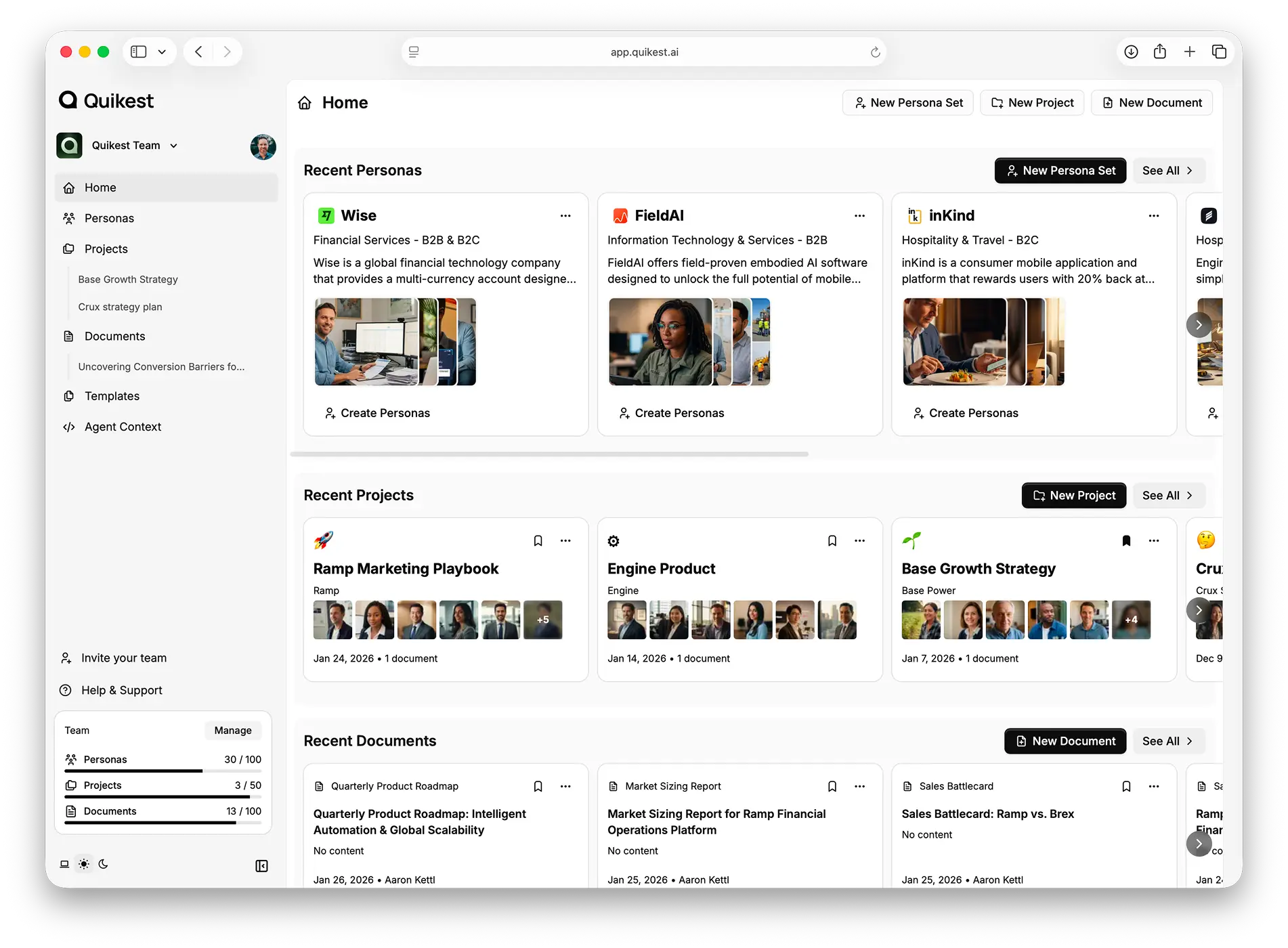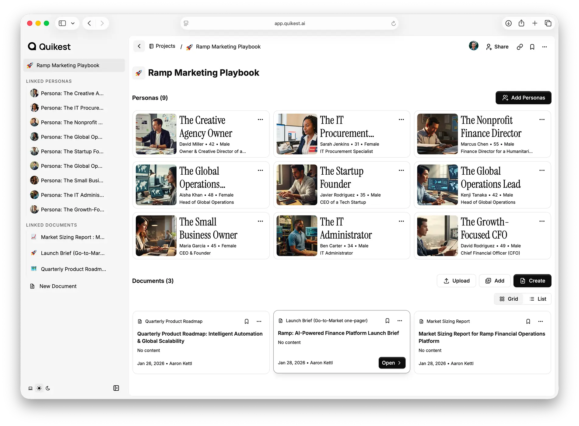 Quikest turns static personas into dynamic AI agents your team can actually interact with. Chat with them to explore motivations, objections, and decision criteria, and keep every document grounded in real customer thinking.